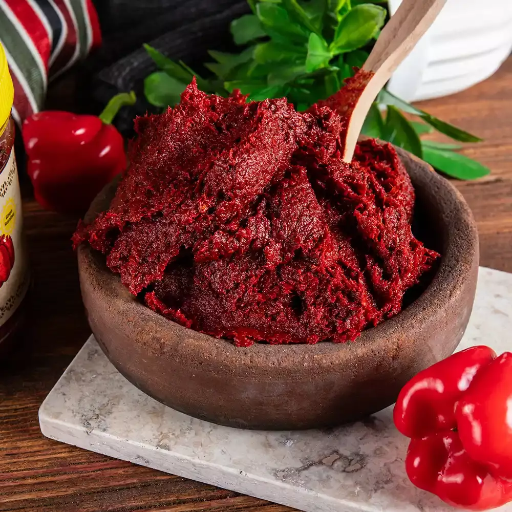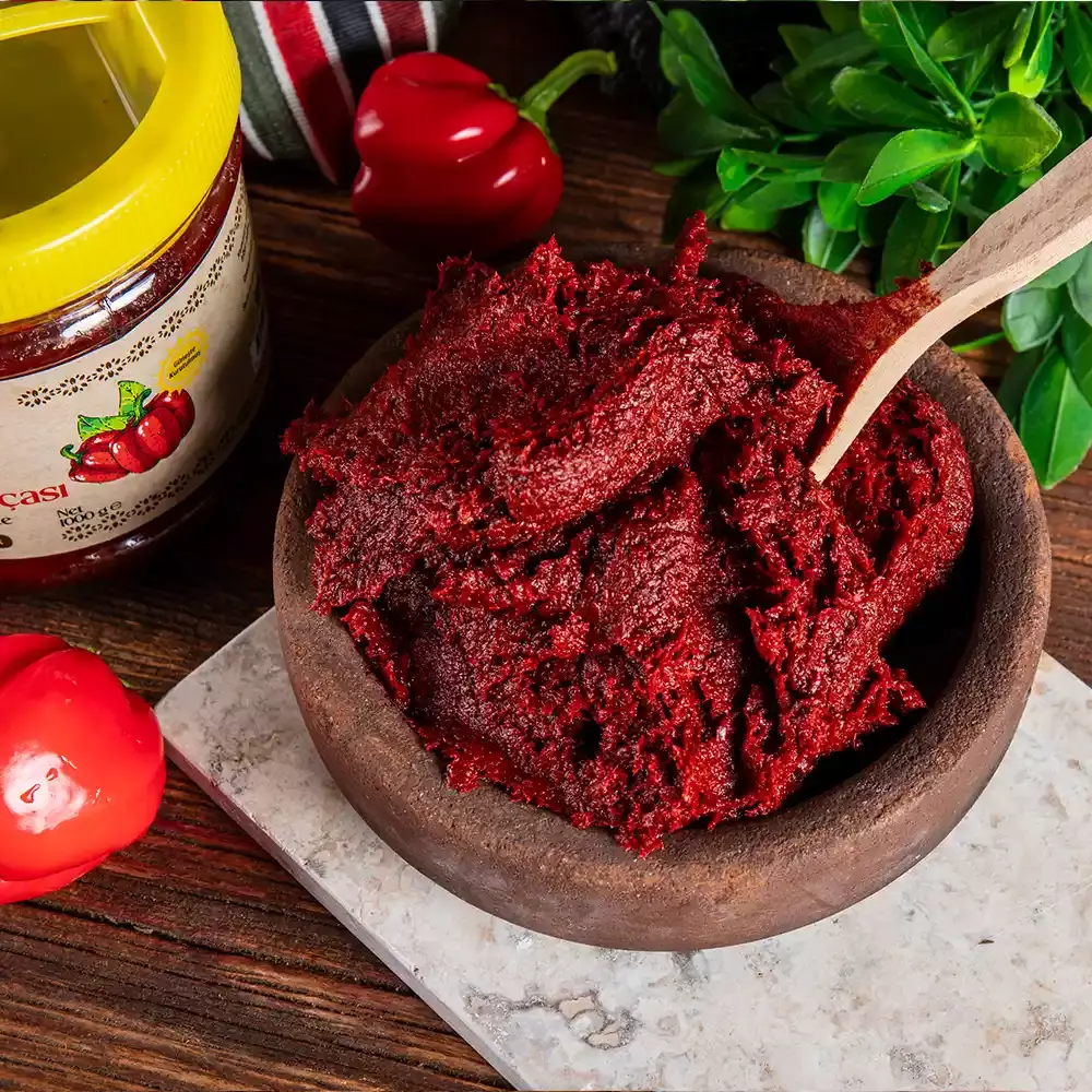 Bahçem kalitesi, bu salçanın her kaşığında kendini hissettirir. Güneşte kurutularak kıvam kazanan bu özel salça, Gaziantep mutfağının özgün acılık dengesini sofralarınıza taşır. Ne yakar ne yakmaz — sadece lezzeti derinleştirir.