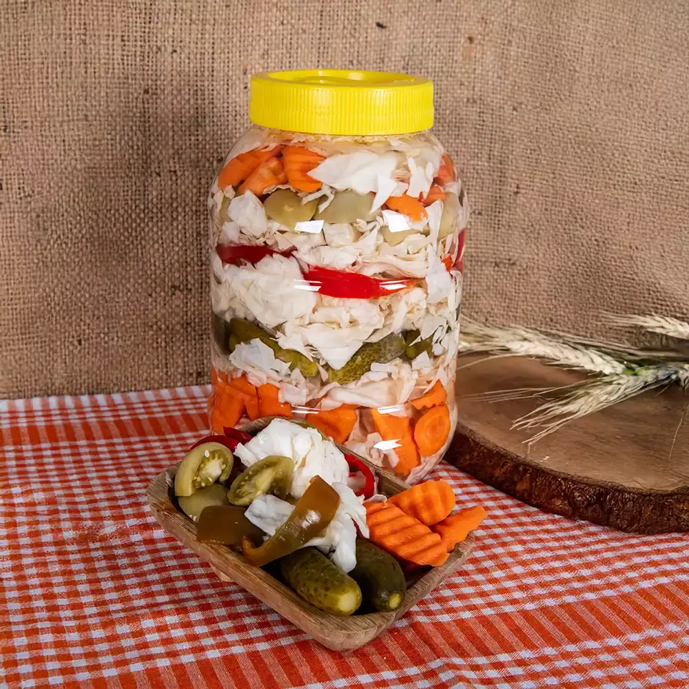 4500 cc bidonun içinde net en az 2750 gram sebze bulunur ve bu yönüyle büyük aileler ve restoranlar için idealdir. Bahçem kalitesiyle gelen bu karışık turşu, Antep usulü lezzet dengesi sayesinde hem ana yemeklerin yanında, hem meze olarak sofranıza canlılık katar.