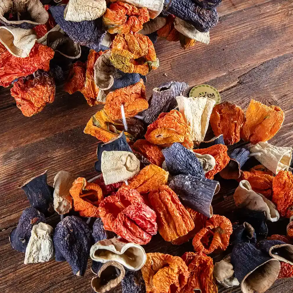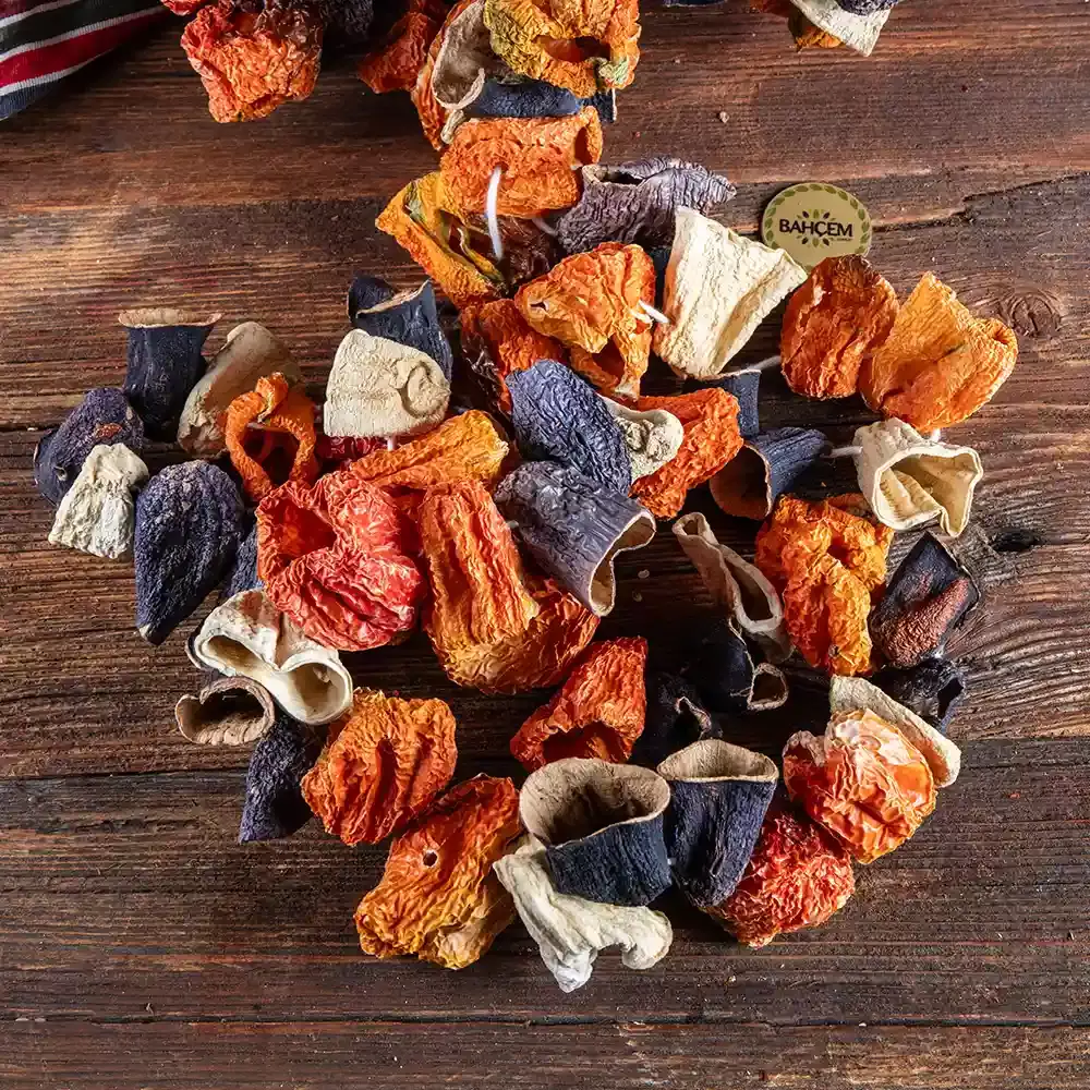 Bahçem dolmalık karışık kurular; özenle seçilmiş patlıcan, biber ve kabakların mevsiminde toplanarak geleneksel yöntemlerle doğal şekilde kurutulmasıyla hazırlanır. Her biri ev tipi yöntemlerle, katkı ve koruyucu madde içermeden, hijyenik koşullarda kurutulmuştur.